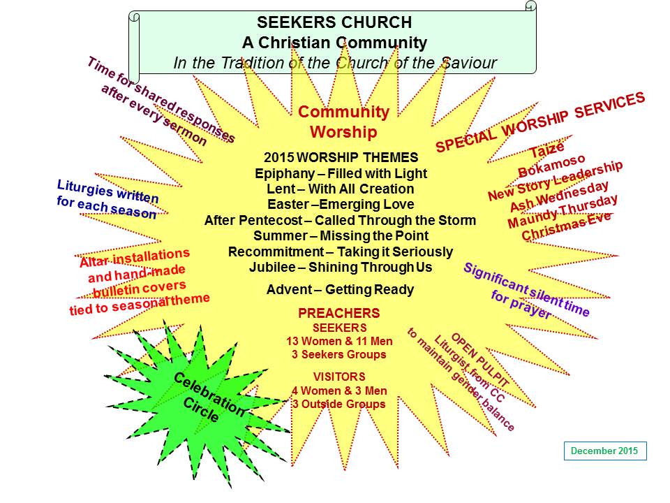 - Peter provided a summary of the worship themes and variety of preachers in 2015 (attached). Twenty-four individual Seekers and three groups, (Guatemala pilgrims, the Eyes to See Ears to Hear Peace Prayer Mission Group and Celebration Circle) offered 42 sermons during the year.
