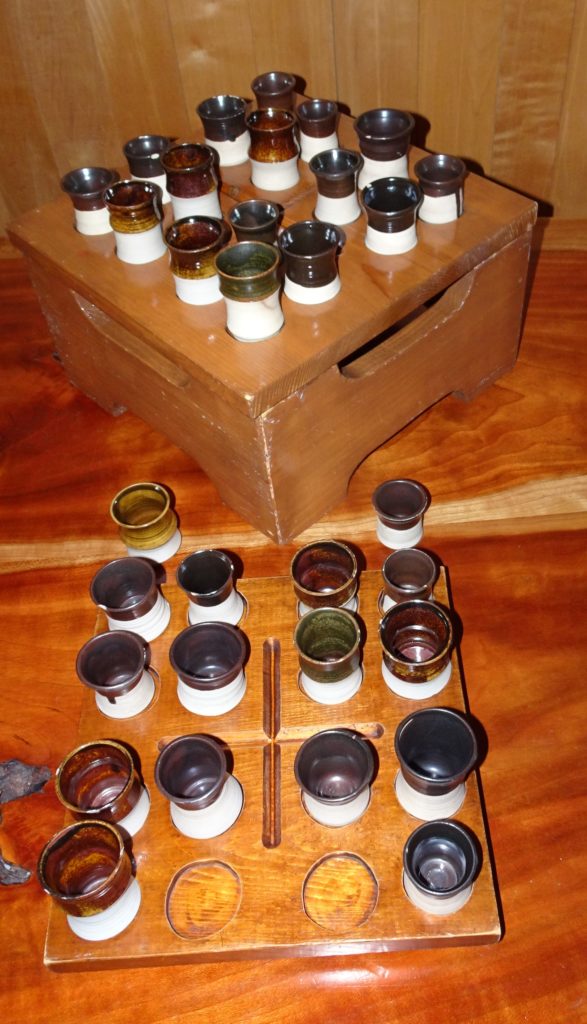 Marjory designed and created these and describes them in her 2009 book on Seekers: “The pattern on the cup, plates and bowl speaks of God as our Source and our Caller with its pattern of waves and circles. In the beginning, God’s spirit brooded over the face of the deep, calling us forth as part of God’s good creation. Then, centered by Jesus, we come to know God’s love for the world and our part in the sacred process of redeeming our broken parts.” (Marjory Zoet Bankson, The Story of Seekers Church: 1976-2006, pg. 30.) Whenever the chalice, plate, or cups have broken over the years, Peter Bankson has repaired them, using the art of kintsugi as his guide, to both restore function and find beauty in brokenness.
