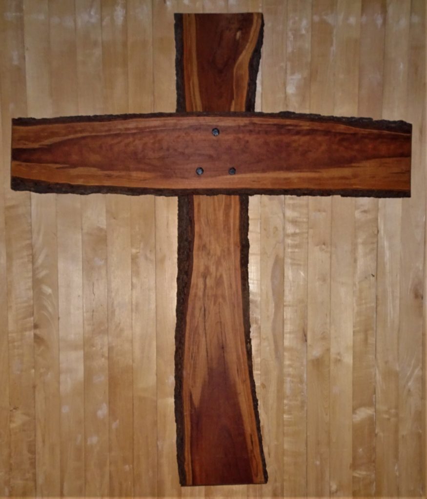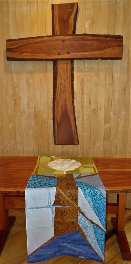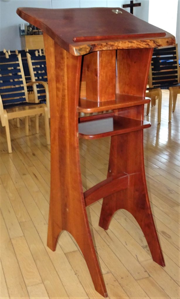 As he was leaving his career as a federal public servant, Seekers member John Schultz sharpened his woodworking skills with support from the Seekers Growing Edge Fund. Around the same time, a cherry tree was reaching the end of its life in the Alexandria yard of Peter and Marjory Bankson. The Banksons had the tree cut into rough slabs and air dried it under their deck until Seekers was ready to move to its new home and John was ready as a woodworker. John then made the Seekers cross, modeled on the cross at the Embassy Row home of Church of the Saviour, from the now-dry cherry wood, along with the altar table and pulpit.