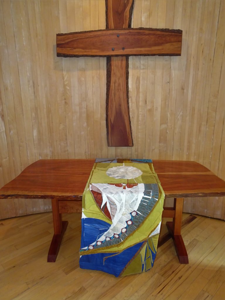 We occasionally use special altar cloths handmade by Seekers. Two depict people on their perimeter as a symbol of inclusiveness; one was made by both our adults and children at a weekend overnight event and the other was made in a Sunday School class. The third is a quilt made by Margreta Silverstone.