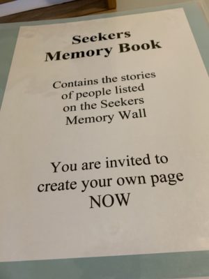 When I was at Seekers a couple of weeks ago for the Black Lives Matter demonstration, I took a picture of the tiles on the wall, which is on the back stairway between the lower floor and sanctuary floor, to remind us of the names that are there, and of the many spaces left for those of us who will be remembered in the future. We are not adding a tile this year. but I am asking Deborah to slowly show the current wall so that we can hold a moment of silence for those we have honored and still remember. If there is someone you are thinking of today, I invite you to put their name in the chat box so we can hold all of these people we loved in prayer.