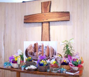 The Easter altar included an accordion fold image of a complete bread loaf and a broken loaf.
