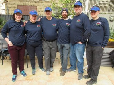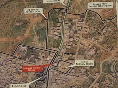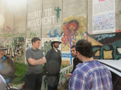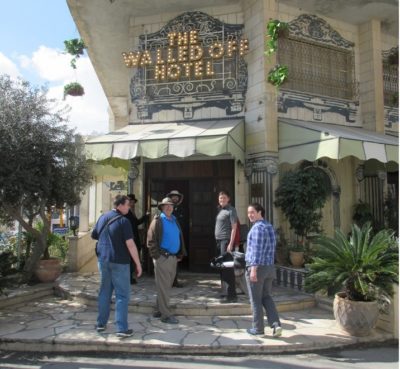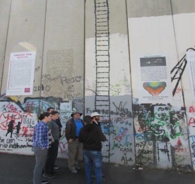(Slide 8) The next chapter of this story is in February of this year. Our family went to Israel for Ron’s 65th birthday. We wore the street art of matching shirts and hats. American tourism was down, so unbeknownst to us, our Palestinian guide had used one of only 10 border crossings he was allowed a year to come and pick us up and bring us to Bethlehem. It would have been so easy to take a taxi, but I think he was worried we would be fearful to cross alone. The crossing was much harsher than four years before. Every bag was searched, mirrors under the car to look for bombs, and I was just so annoyed that Christo had a shaggy beard and needed a haircut—he reminded me of a depiction of a terrorist.