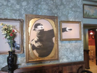 (Slide 10)But here was the amazing part. Banksy had decided, starting in about 2013, to focus his attention and money on Bethlehem. He had organized the building of the Walled Off Hotel, filled with puns and tromp d’oeil art. And while Americans haven’t flocked to the area, the hotel provided work for construction workers, hotel workers for the mostly British travelers, restaurant workers, museum curators and shop managers and he helped women nearby to spawn Banksy inspired protest art.
