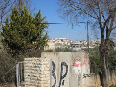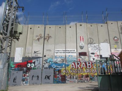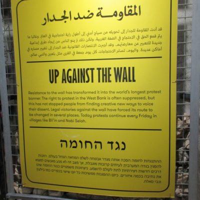 (Slide 9) We went first to see the wall. It had been augmented with 30’ slabs in 2015 – probably just after we had first visited. There were many types of stencils—some by Banksy, some by followers using the barbed wire motif. Just on the other side of the wall, you could have seen Jerusalem on a hill—now few buildings were high enough to see anything except the wall in the Northwestern direction.