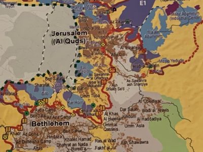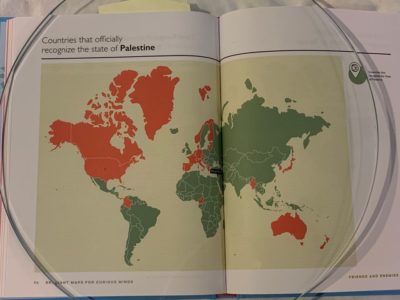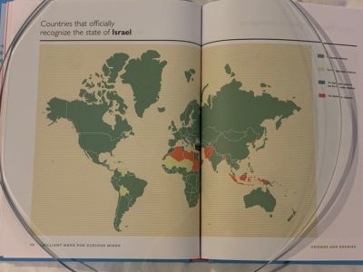 The final chapter occurred in Australia last fall. There was a pop-up Banksy exhibit in Sydney, and I went one day when Ron was teaching. Banksy’s former manager had pulled together many prints, sculptures and montages of Banksy’s art to raise money. And he told the story in a film at the beginning of the show that all of Banksy’s income and attention is now focused on Palestine. While he has participated in such shows as the Amsterdam one we saw, each show includes Palestinian images and description and the funds go to developing jobs and education to build the social fabric of Bethlehem. And after Christmas, I was looking at a new favorite book, Brilliant Maps for Curious Minds, and I was examining these two maps.