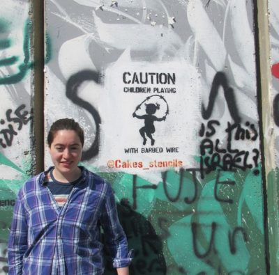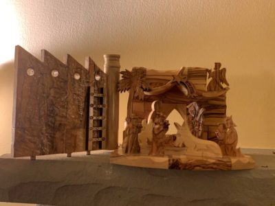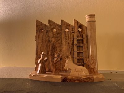 In 2015, Ron and I went to Israel, and toured with a guide who had access to the A and B areas of Israel, so we saw much of Palestine’s ancient lands, including Jericho, and Herod’s palaces in the western desert, but even a senior guide who was Israeli had no access to Bethlehem which is a C area, owned and controlled by Palestinians, with no Israeli access. As we were looking at ancient sites, modern sites, and I wanted to see Biblical sites, we hired a Palestinian guide to lead us through Bethlehem. We were driven to the wall around Bethlehem, walked through the special gate for foreign tourists, and met a car with our Palestinian guide on the other side of the wall. During our transit, I had been warned to look for Banksy stencils on the wall, which were the start of the use of the wall for political protest a couple of years earlier. As we were jostled, and feeling uneasy about the long lines of Palestinians waiting long hours to get out to jobs or hospital access, I took one photo, but noticed several other stencils, which I did not know the import of until later. In 2015, we were told there were few jobs for the people on this side of the wall, and that most tourists who did come to Bethlehem came in American evangelical tours who had foreign drivers, zipped in to go to the Church of the Nativity on Bethlehem Square, kissed the stone where the manger was supposedly located, and left. There was one shop which attracted tourist trade—a workshop where many generations of woodcarvers made nativity sets. Some buses stopped there on the way out, and we were dropped there to get a taxi back to Jerusalem (only 10 km, but so much religious and political distance away).