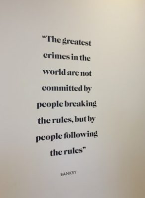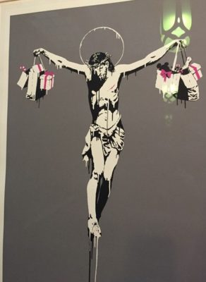 Putting saltiness back into our lives is what Living Water is supposed to help people in Seekers do. Many of you have turned away from typical cultural expectations to promise to center your lives, even if you don’t succeed all the time, to live in community, when we are in an individualistic society, and to be creative—not necessarily follow all the rules. And Living Water is supposed to help us go deeper in our spiritual lives to keep us enlivened in our creativity. I know most of our mission groups do this, but Living Water tries to keep the silent retreats and various classes in the School for Christian Growth going for this purpose. The images silent retreat leaders offer try to give us alternate ways to keep the Christian message alive and growing in us—not ossifying into rules. Every so often, we offer classes in SCG to try to deepen our disciplines of prayer, journaling, and the meaning of tithing and living in community. But our goal is to help keep us shining our lights through creativity and not hiding our light under a bushel. And I found, that the creativity of Banksy penetrated over time—similarly, some retreats have given me messages that took root and grew over time. This is what we want to give to our Seekers community.