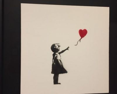 (Slide 6) The little girl with her heart as a balloon blowing away was an image I knew I had seen in Palestine, and the exhibit said it had been used in Banksy’s installations on various social action topics since the 1990’s and throughout the world.