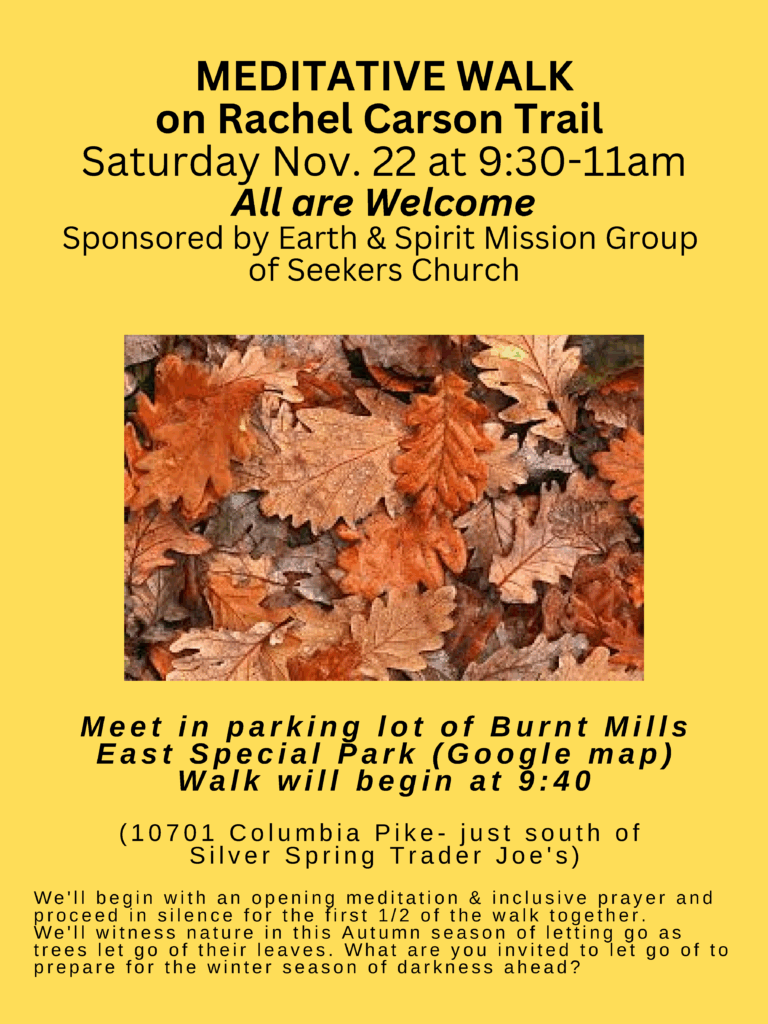 We’ll begin with an opening meditation & inclusive prayer and proceed in silence for the first 1/2 of the walk together. We’ll witness nature in this Autumn season of letting go as trees let go of their leaves. What are you invited to let go of to prepare for the winter season of darkness ahead?
