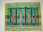 Amdy works in acrylics, oil, water color, pencil and pastel, often including collage elements into his work.  His pieces are full of vibrant, colorful patterns, some evoke African tribal patterns while others clearly depict villages and cities and still others are totally abstract.  Some works recall the pages of a book and at other times a window leaving the viewer wondering if they are looking in or out – maybe both.  Many have elements of his spiritual journey and encompass the iconography of many faiths.  All of Amdy’s work is certainly a window into his artistic soul which has not been hampered by the many adverse circumstances of his daily life.