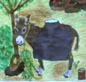 Occasionally a patient will want to paint every day. They are given paints, brushes and paper to use in their room. One of these men was "G.T", who was Eritrean. His stay at Christ House was a long one, as it was discovered after he had arrived and healed a wound, that he had a throat cancer which was inoperable. Many of G.T.’s paintings were of the Holy Family. In them there was always a donkey. One of his paintings seemed to be a village scene. A donkey is chained to a tree by a small house. Behind the donkey is a low stone wall which surrounds a rounded pile of cut grass or hay. On the wall we see a lizard and a small goat. Another goat is in the yard. Chickens are about. There is a field of corn.
