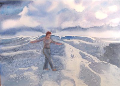 When I wrote my spiritual autobiography to read out loud so that I could become a Steward, I used the metaphor of walking on water to describe my life. Because I like combining words and pictures (I presented my spiritual autobiography as a slide show), I painted a picture of myself walking on water. It shows me, with my arms outspread walking, on giant waves in a stormy sea.