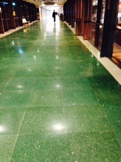 I found many thin places, the most magical and inspiring of which was the very, very long window-enclosed bridge that connected the residence where we lived and its parking garage to the Johns Hopkins hospital where Eric received treatment. I crossed that bridge going one way and later the other many times a day. The floor was a deep green, sparkling with bits of embedded mica or foil or something else glittery.. The texture and intensity of the light through the windows varied tremendously – sunlight by day and, at night, stars, moon, car headlights, and streetlights. The glass sides of the bridge were covered with white arcs that were probably there to keep birds from crashing into the windows but they reminded me of the Hebrew letter, yod, which is the first letter in the Hebrew name for God and consequently has sacred significance in the Kabbalah. It is also used in some Tarot cards where it represents divine presence. I did feel a divine presence when I walked across this bridge. It was truly a thin place and it helped me walk on water during Eric’s treatment at Hopkins.